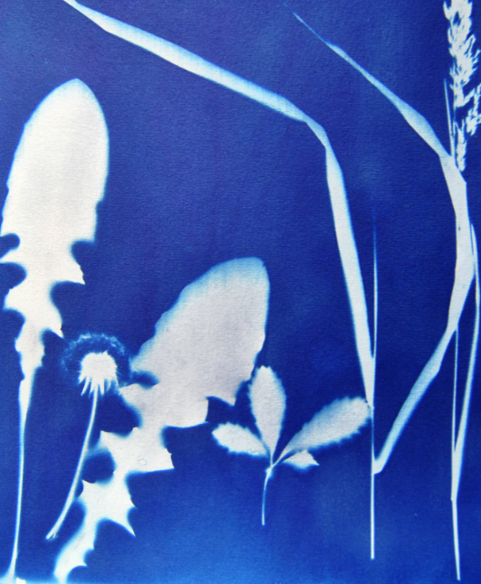 La cyanotypie est un procédé photographique monochrome négatif ancien, mis au point en 1842 par le scientifique Sir John Frederick William Herschel, par le biais duquel on obtient un tirage photographique bleu de Prusse, bleu cyan. Le soleil vient révéler sur un support la forme d’un objet ou d’un végétal posé dessus.