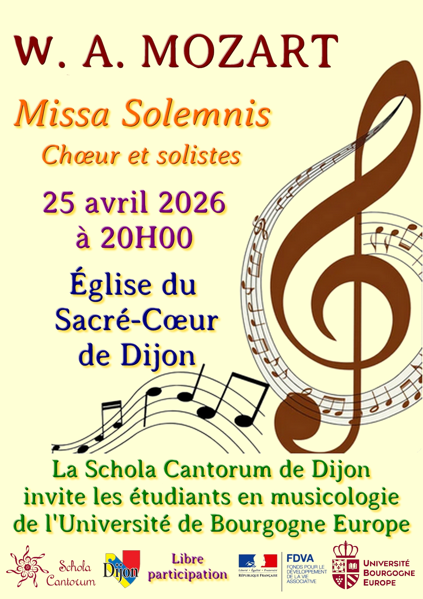 Pour ce concert avec chœur et solistes, la Schola Cantorum de Dijon associe les étudiants de la faculté de musicologie de l’Université Bourgogne Europe sous la direction de Xavier Le Diagon. La Missa Solemnis K139 est la première messe composée par Mozart à l’âge de 12 ans ! Elle témoigne déjà du génie du jeune Mozart dont la musique associe légèreté et profondeur dans l’alternance des moments de recueillement, d’intensité dramatique, de joie et de paix intérieure. Une véritable perle musicale.