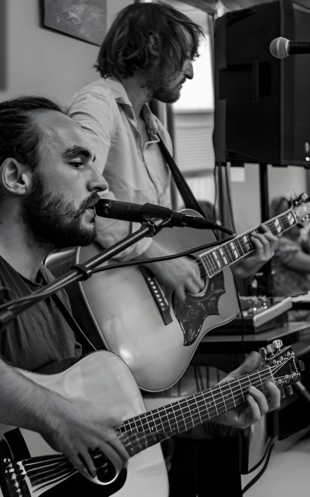 Thom et Val servent, dans un duo acoustique mélodieux, un panaché de reprises et compositions rock/folk typées 60’s-70’s (The Beatles, Pink Floyd, Neil Young…)