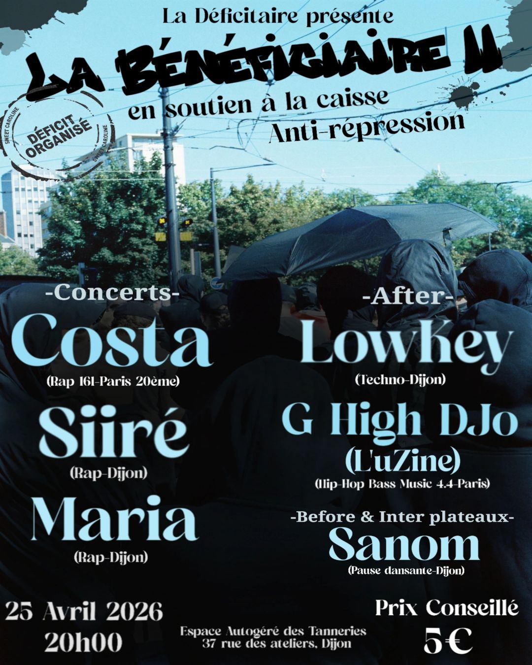 Le 25 avril , on se retrouve aux Tanneries pour une grosse soirée rap / techno en soutien à la caisse de solidarité contre la répression de Dijon. 🔥🏴🚩