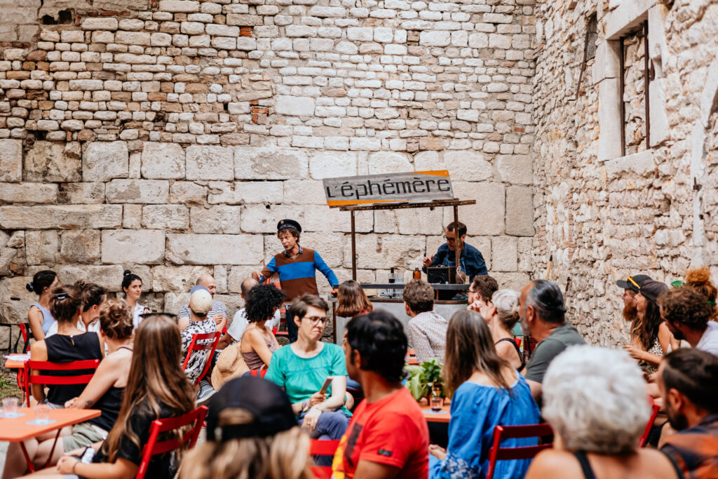 Ils arrivent avec leur bistrot éphémère, ils donnent vie à un bar. Il y a là un patron qui mettra toute sa poésie en œuvre pour que vous vous sentiez bien. Il y a un corps qui redonnera vie à quelques morts d’alcool. Et un musicien qui accompagne le tout.