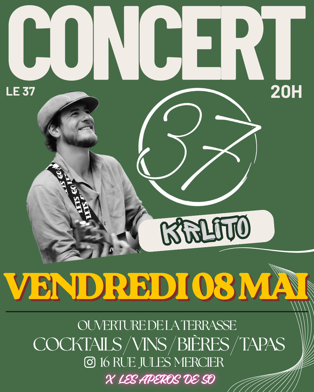 Avec Augustin et Alexis du 37, nous sommes heureux de vous convier à l’ouverture de la terrasse du bar en musique avec K’rlito 🍹🎸