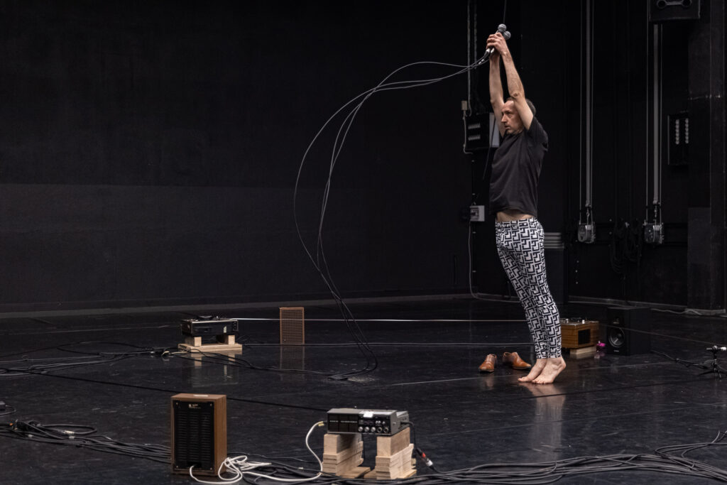 Le rapport au public n’est ni frontal, ni circulaire : le corps circule à travers ces différents espaces, module la relation, joue du dedans et du dehors, du visible et de l’audible. Le public est alors immergé à l’intérieur du son et du mouvement.